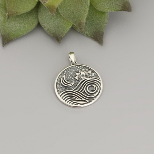 Sterling Silver Lotus and Moon and Wave Pendant – Meaningful Jewelry with Symbols
