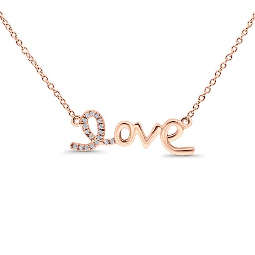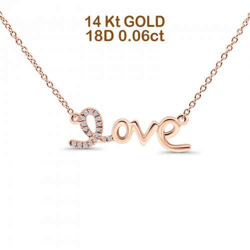 14K Rose Gold 0.08ct Round Shape Love Script Heart Diamond Pendant Chain Necklace 18″ Long