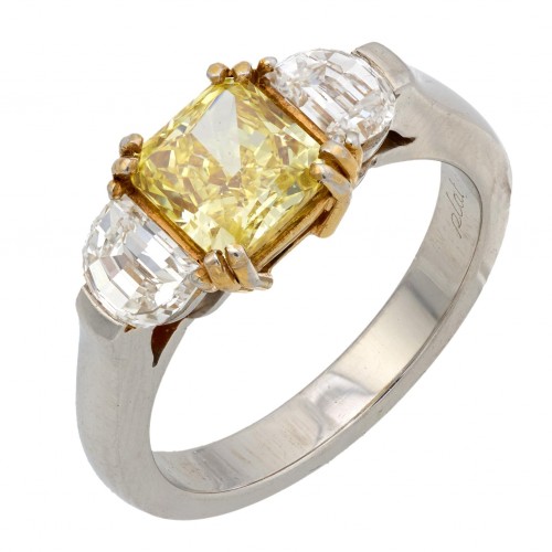 Vintage GIA 1.54 fancy intense yellow diamond platinum 3 stone ring