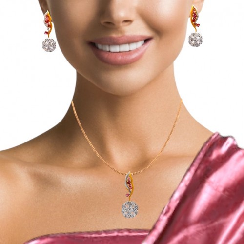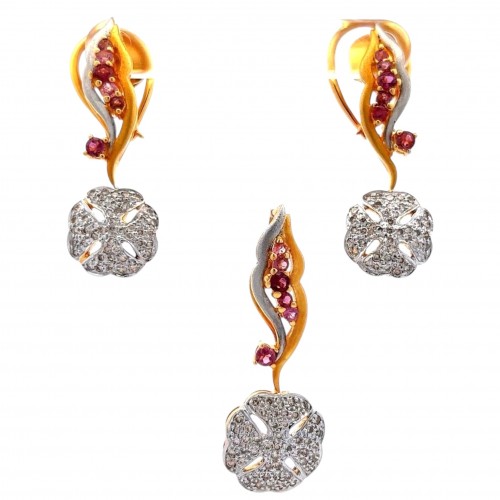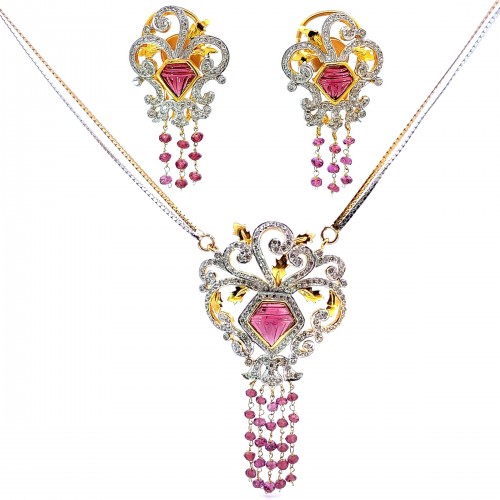 18K Two Tone Gold Pendant Earring With Natural Diamond & Pink Tourmaline Gemstone Jewelry Set