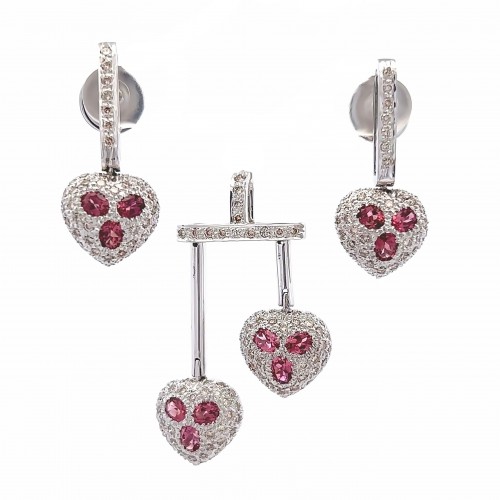 18K White Gold Pendant Earring Heart Set with Natural Diamond & Pink Tourmaline Love Jewelry