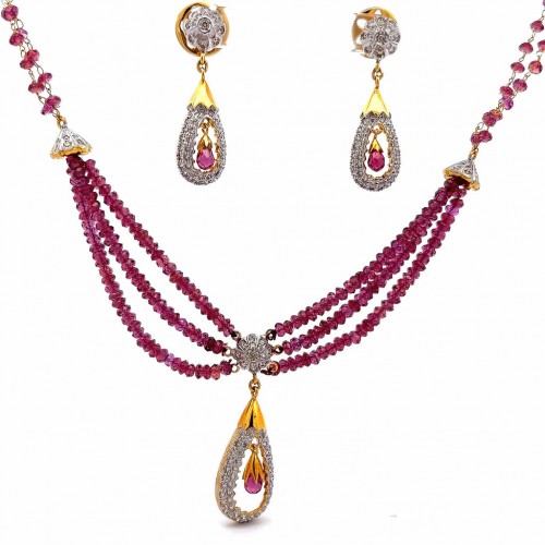 18K Gold Necklace Earring Bridal Jewelry Set Two-Tone Chain with Natural Rubellite Drops & Diamond