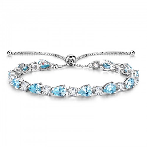 “Glamour Teardrop” March Birthstone Aquamarine Sterling Silver Tennis Bracelet Classic Bolo Chain