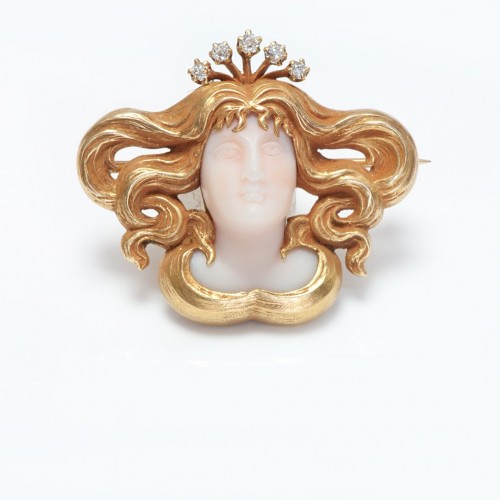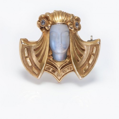 Antique Art Nouveau Gold Diamond Carved Moonstone Lady Pendant Brooch