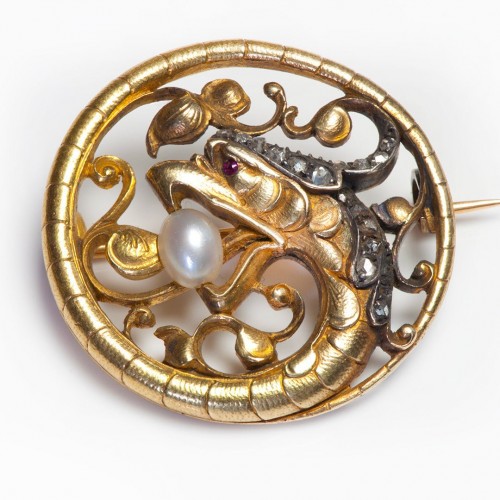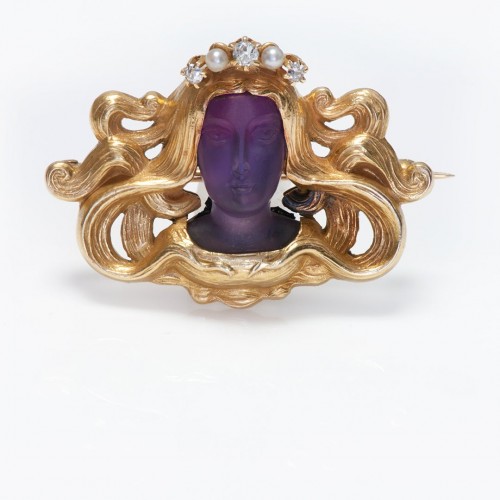 Antique Art Nouveau Gold Diamond Pearl Carved Amethyst Lady Brooch