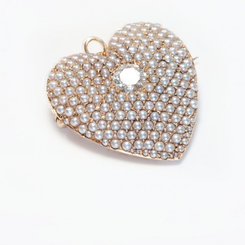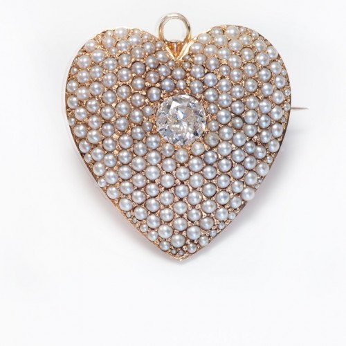 Antique Edwardian Gold Diamond Seed Pearl Heart Pendant Brooch