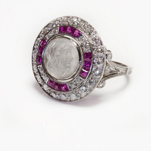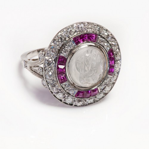 Antique Edwardian Platinum Moonstone Cameo Diamond Ruby Ring