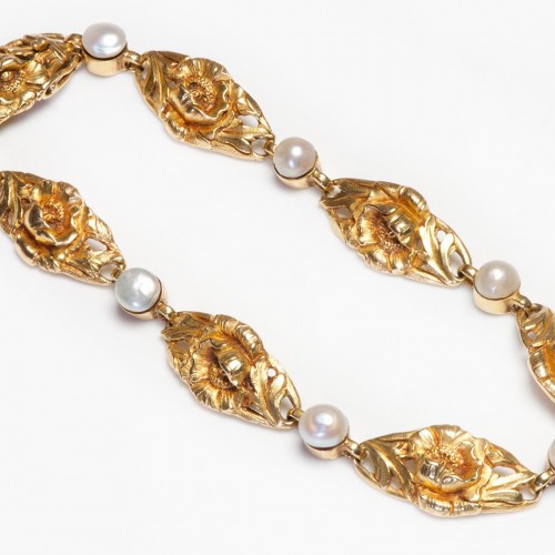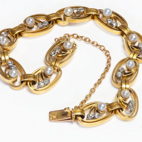 Antique French 18K Gold Old Mine Cut Diamond Pearl Knot Bracelet