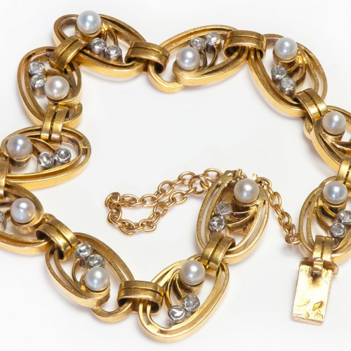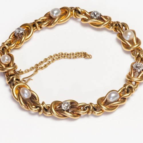 Antique French 18K Gold Old Mine Cut Diamond Pearl Knot Bracelet