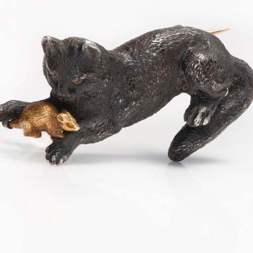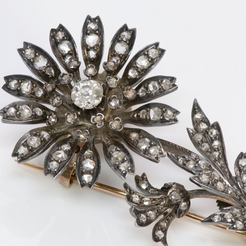 Antique French Pierrot Diamond & Ruby Brooch in Silver and 18K Gold