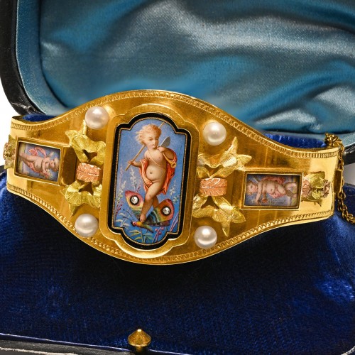 Antique Victorian Gold Bracelet with Enamel Cherubs and Pearls