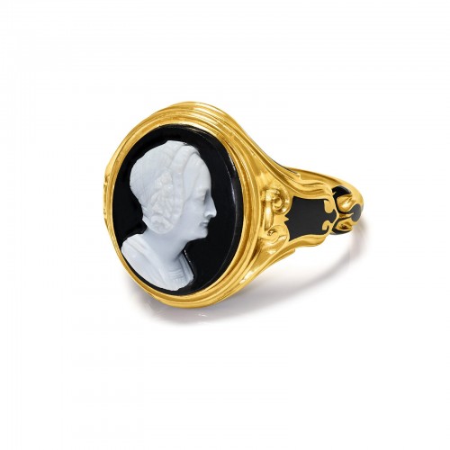 Antique 1840 Victorian Gold Black Enamel Cameo Portrait Ring