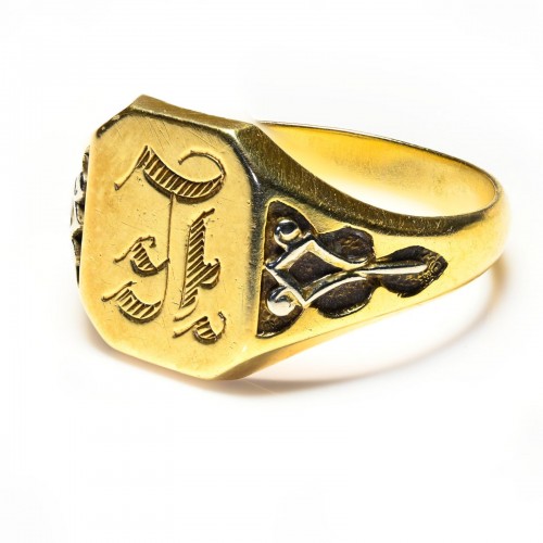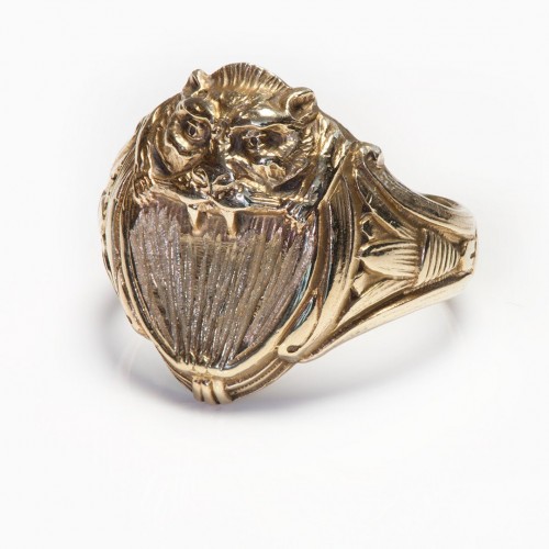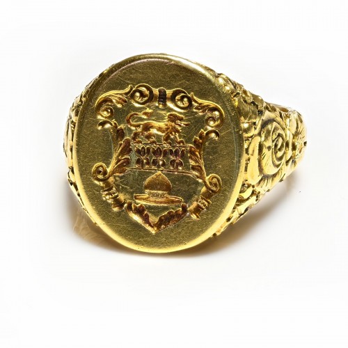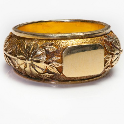 Antique 14K Gold Men’s Crest Ring with Carved Floral and Lion Shield Design