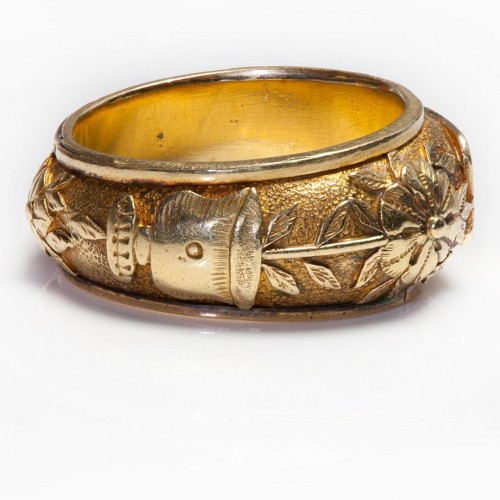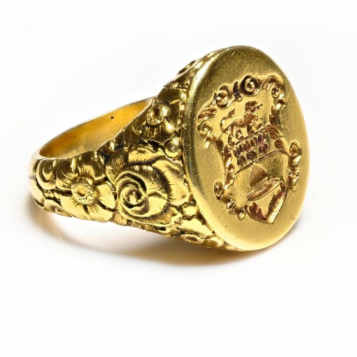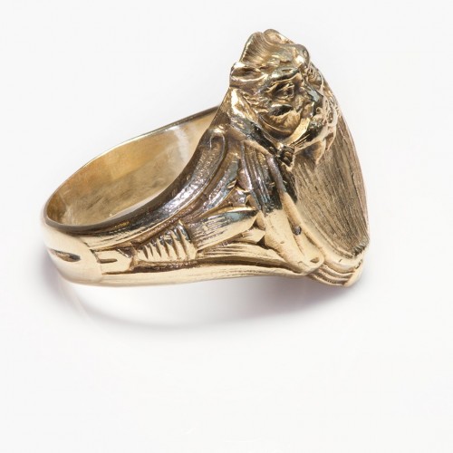 Antique 14K Gold Men’s Crest Ring with Carved Floral and Lion Shield Design
