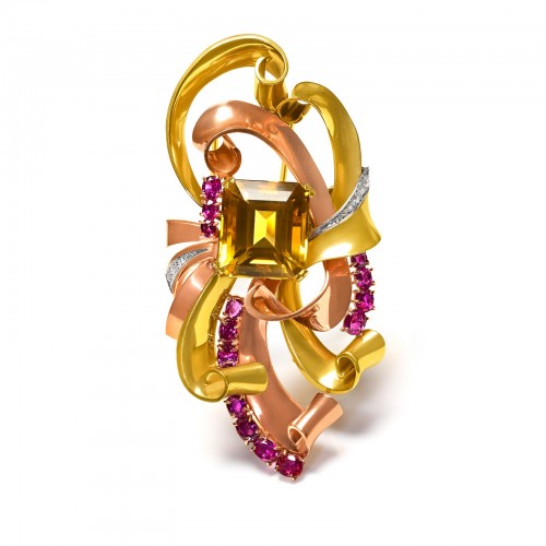 Two-Tone Retro Gold Scroll Brooch with Citrine, Rubies, and Diamonds
