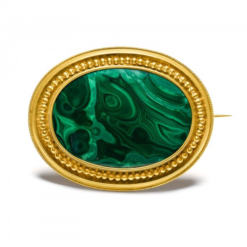 Victorian 15K Gold Malachite Brooch with Portrait Compartment on the Reverse