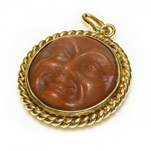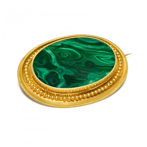 Victorian 15K Gold Malachite Brooch with Portrait Compartment on the Reverse