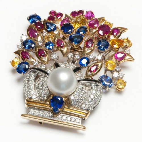 Vibrant Diamond Pearl Multi Gemstone 18K Gold En Tremblant Basket Pendant Brooch