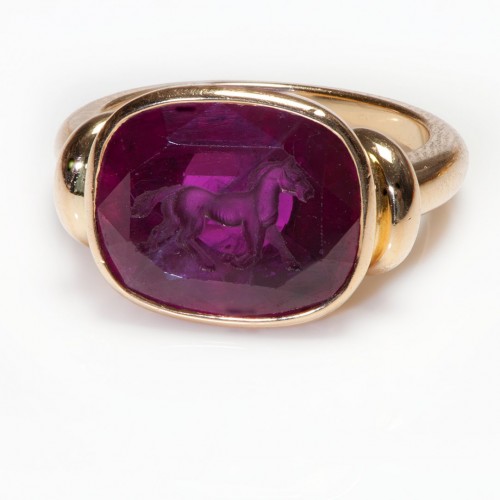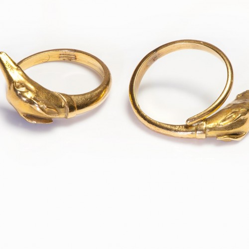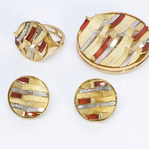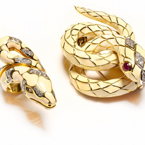 Vintage 18K Gold Enamel Ruby Diamond Snake Ring and Brooch Set