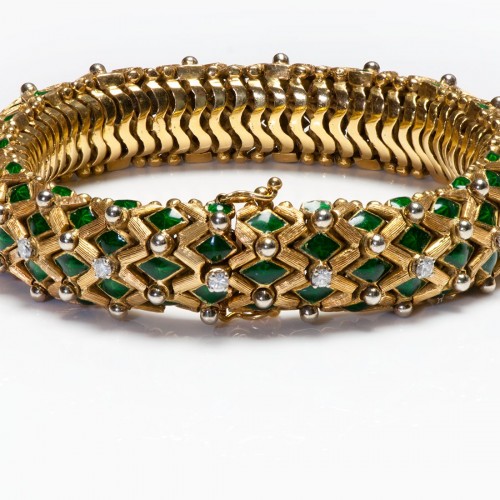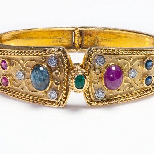 Vintage 18K Gold Ruby Sapphire Emerald Diamond Bangle Bracelet