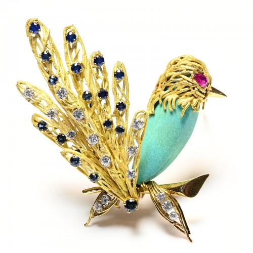 Vintage French 18K Gold Bird Brooch with Blue Agate, Diamonds, Sapphires and Ruby