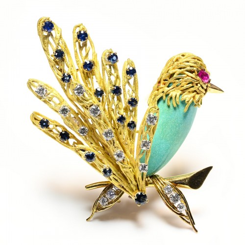Vintage French 18K Gold Bird Brooch with Blue Agate, Diamonds, Sapphires and Ruby