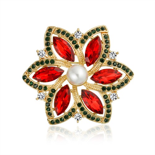 Large Statement Red Green Marquise Crystal & Fashion Pearl Flower Brooch Scarf Pin Gold Plated