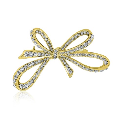 Winter Wedding Glittering Crystal Bridal Large Ribbon Bow Brooch Pin Gold Plated Gold Tone