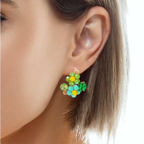 Handcrafted Floral Cluster Dangle Earrings with Green Roses & Multi Colored Beads Jewelry