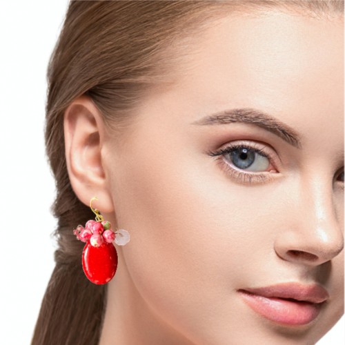 Handcrafted Red Oval Drop Earrings with Pink Bead Clusters Jewelry