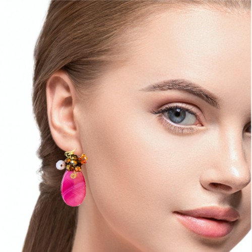 Handcrafted Hot Pink Teardrop Dangle Earrings with Multicolor Bead Jewelry