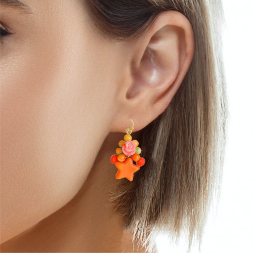 Handcrafted Orange Star Dangle Earrings with Coral Rose & Bead Clusters – Boho Chic Handmade Jewelry