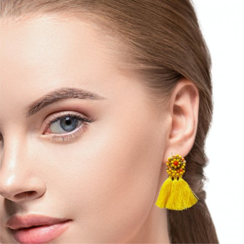 Cheerful Yellow Tassel Drop Earrings with Multicolor Bead Unique Handcrafted Jewelry