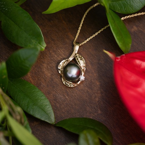 Maile Tahitian Black Pearl Pendant in Gold with Diamonds – 9-10mm