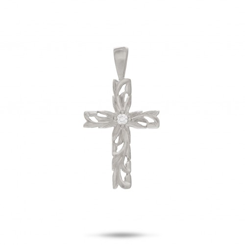 Hawaiian Heirloom Old English Scroll Cross Pendant in White Gold with Diamond – 23mm