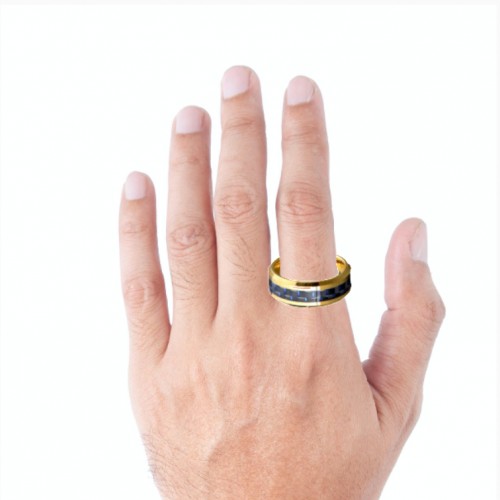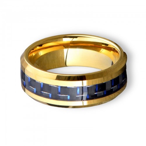 Tungsten Ring Yellow Gold Plated With Blue Carbon Fiber Inlay Beveled Edges Band 9.5