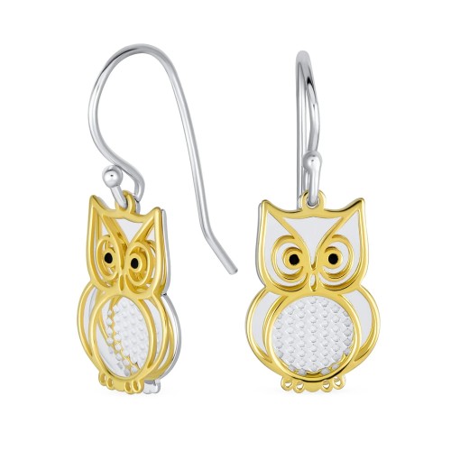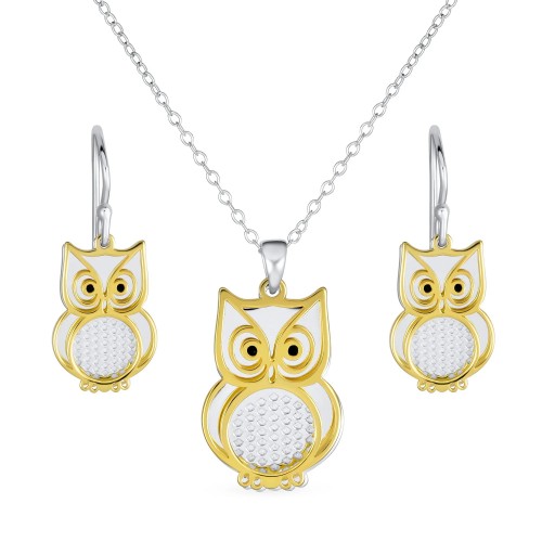 Two Tone Owl Pendant Necklace & Earrings Jewelry Set 14k Gold Plated Silver