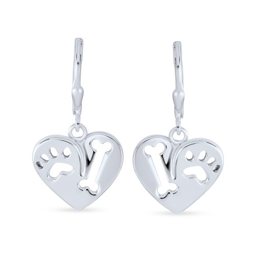 I Love My Dog Paw Print Dangle Heart Shape Earrings Animal Lover .925 Sterling Silver Lever back