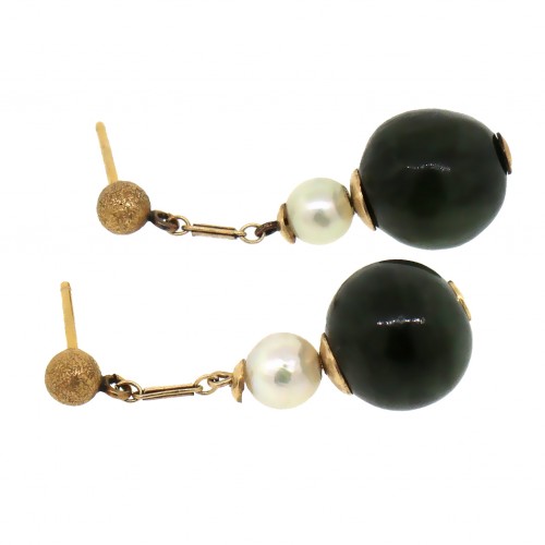 14 kt Yellow Gold Pearl and Jade Hanging Earrings