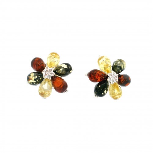 Multicolor Amber Flower Stud Earrings – Cherry /Green/ Honey Prong Set in 925 Sterling Silver