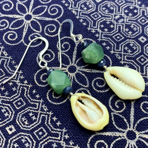 Cowrie Shell With Serpentine and Sapphire Earrings With Sterling Silver French Wires