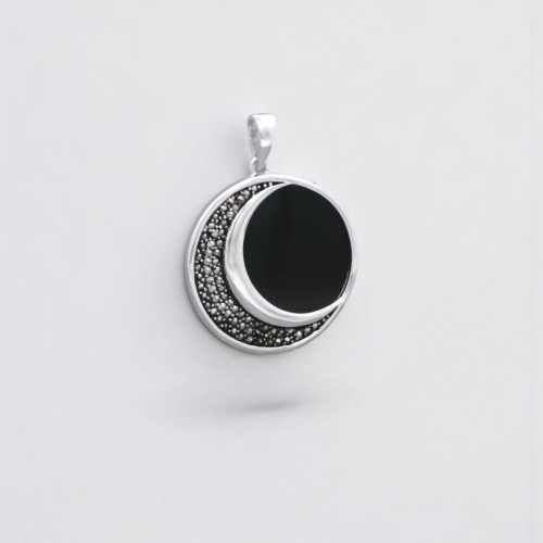 Celestial Crescent Moon Pendant – Sterling Silver with Black Onyx & Marcasite