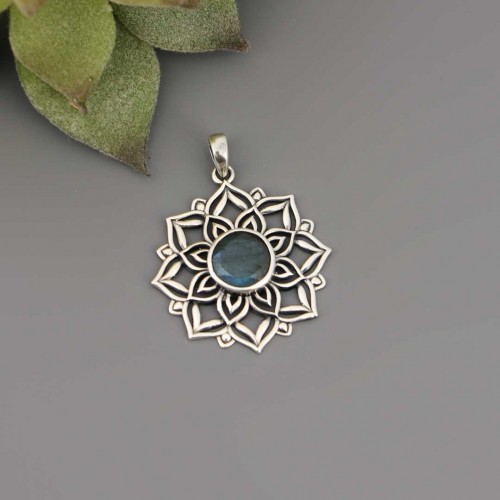 Lotus Mandala Pendant with Labradorite Gemstone – Sacred Symbol of Intuition and Light