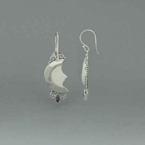 Moon Face Earrings – Sterling Silver Amethyst Accents, Hand-Carved in Bali