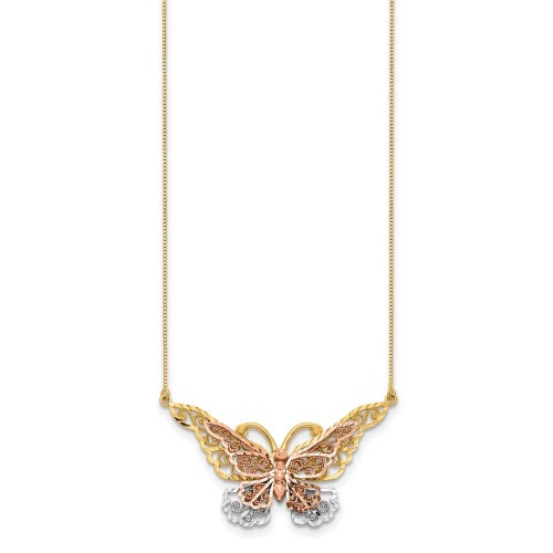 14k Yellow and Rose Gold with White Rhodium Large Filigree Butterfly Necklace 17in