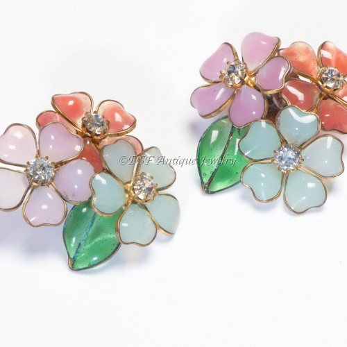 Coco Chanel Paris 1930’s Gripoix Pink Green Red Glass Camellia Flower Earrings