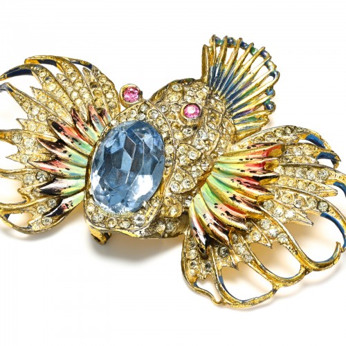 Coro Craft 1944 Sterling Silver Blue Pink Crystal Enamel Rock Fish Brooch