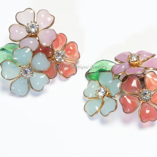 Coco Chanel Paris 1930’s Gripoix Pink Green Red Glass Camellia Flower Earrings