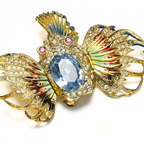 Coro Craft 1944 Sterling Silver Blue Pink Crystal Enamel Rock Fish Brooch