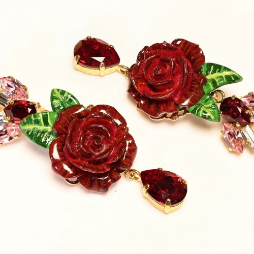 Dolce & Gabbana Red Green Resin Rose Flower Pink Crystal Earrings